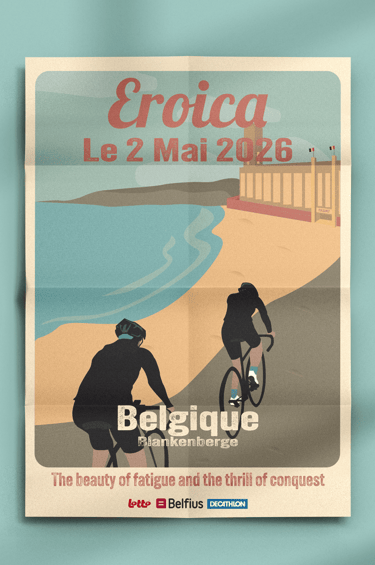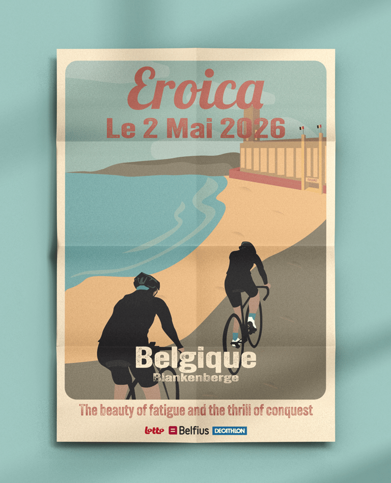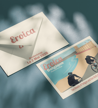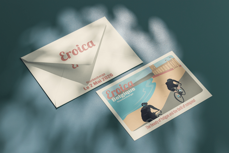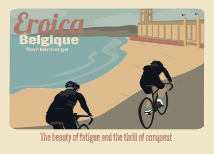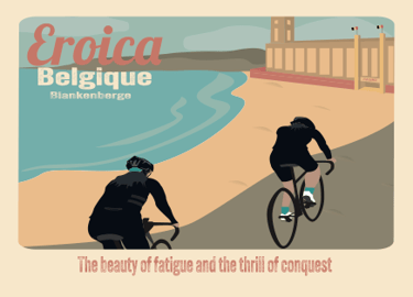 Création d’une affiche A3 et d’une carte postale pour la première édition belge de la course cycliste Eroica. Une affiche rétro pour une course cycliste, inspirée du style de Tom Purvis, un artiste connu pour ses affiches vintage.