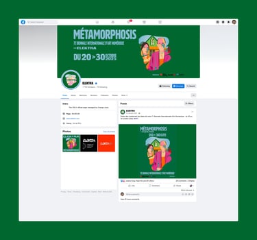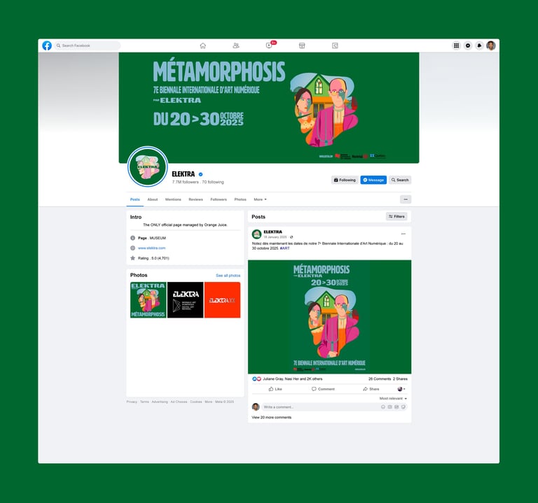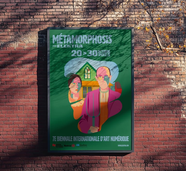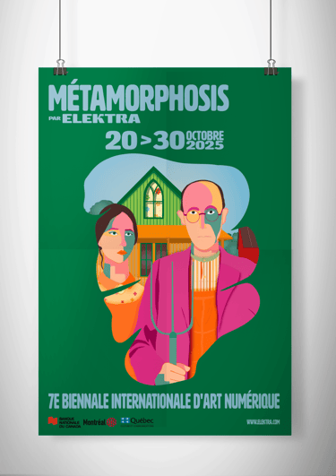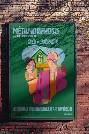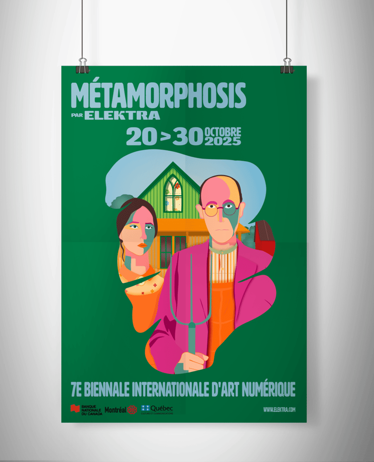 Création d’une illustration et d’une identité visuelle pour la 7e Biennale Internationale d’Art Numérique « métamorphosis », incluant une affiche urbaine et un habillage graphique pour la page Facebook du musée Elektra de Montréal.
