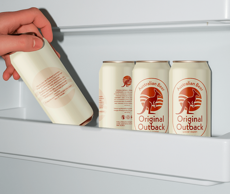 La canette slim a été privilégiée pour son élégance et parce qu’elle s’accorde parfaitement avec la forme du logo. Son design épuré permet une lecture claire tout en renforçant l’identité visuelle de la marque.